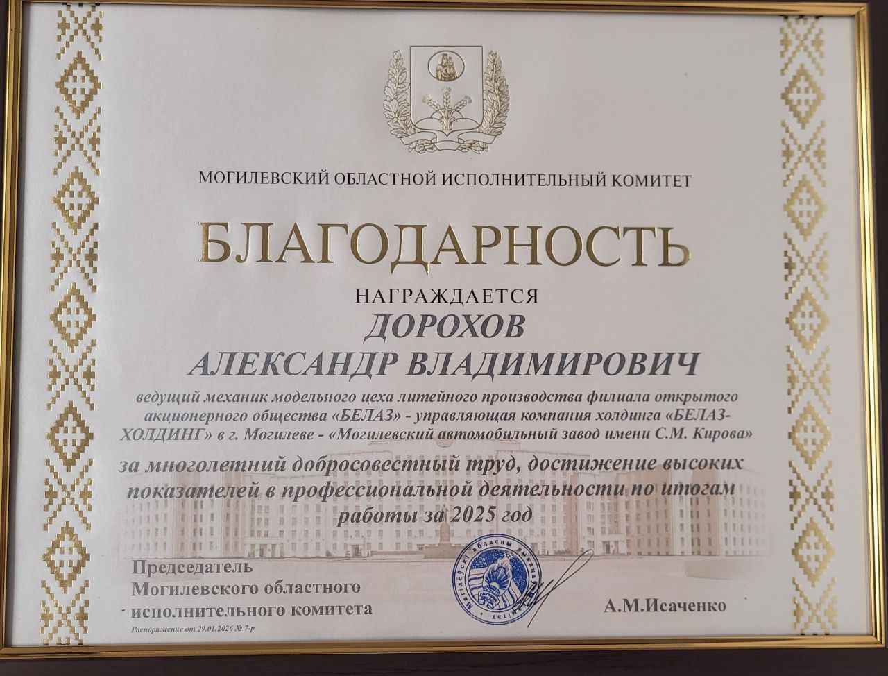 На торжественном собрании представителей трудовых коллективов по итогам социально-экономического развития города Могилева за 2025 год за многолетний добросовестный труд, высокий профессионализм, достижение высоких показателей в профессиональной деятельности по итогам работы за 2025 год Благодарностью Могилевского облисполкома награжден ведущий механик модельного цеха литейного производства филиала ОАО «БЕЛАЗ» — управляющая компания холдинга «БЕЛАЗ-ХОЛДИНГ» в г. Могилеве — «Могилевский автомобильный завод имени С.М. Кирова» Александр Дорохов.